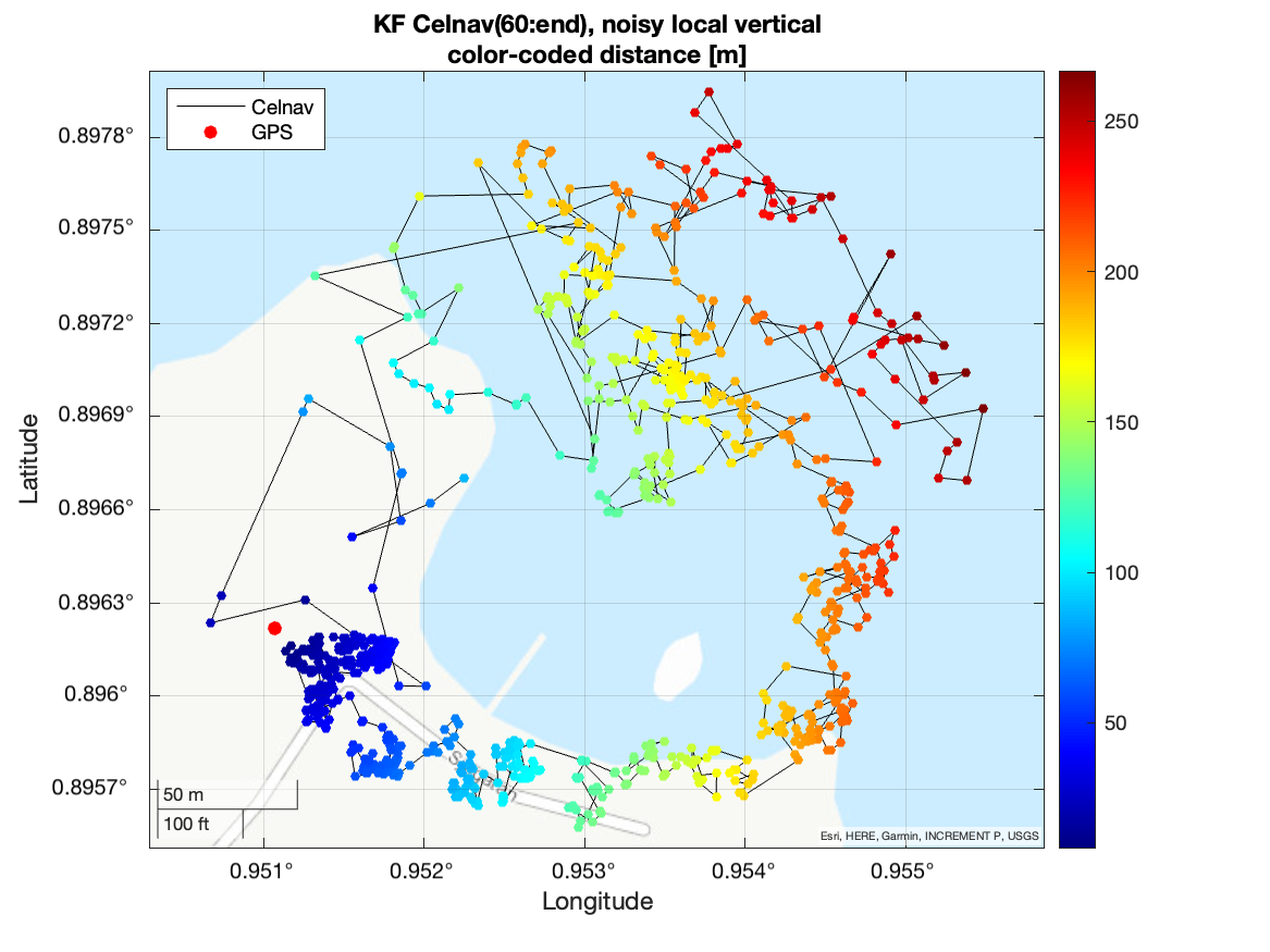 The raw Celestial Navigation (lat,lon) positions are computed using angular measurements between the stars and Zenith, where the Zenith is computed from an IMU. Unfortunately accelerometers in IMUs are inherently noisy, and this results in noise in the Zenith and therefore noise in the computed position.
